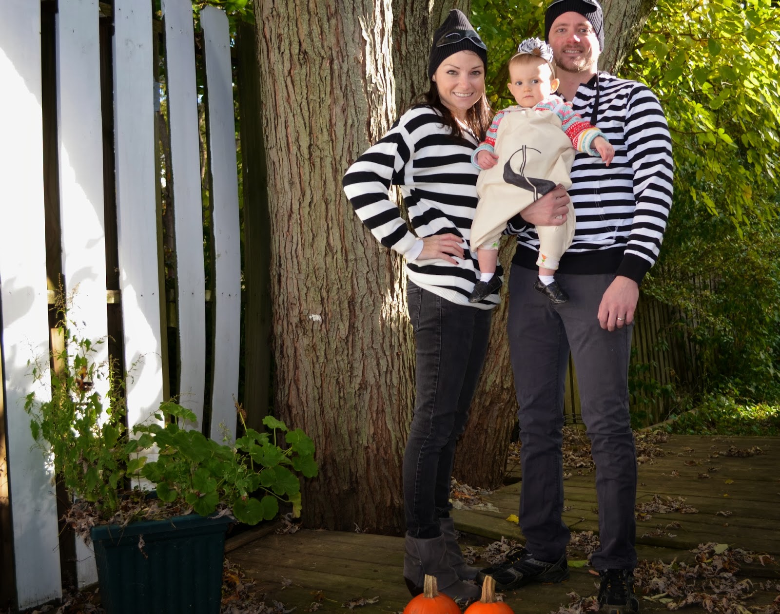 So I found the idea on pinterest…(where all the good ideas are) and knew I wanted to try it for our little family of three! The money bag costume was based on a wearable blanket pattern but instead of arms I just sewed an elastic hem at the top and added two elastic straps to hold it up. Here are the pics of how our mommy/daddy robbers and little bag of money baby costume turned out. Enjoy!